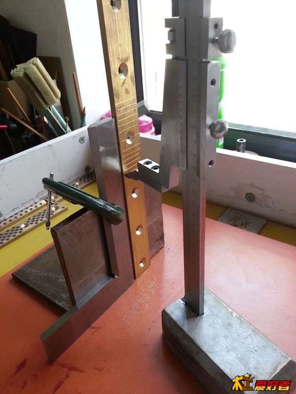 太高了,沒(méi)辦法畫垂直,可以在靠山上夾一把角尺,基板的直邊靠在角尺上劃線