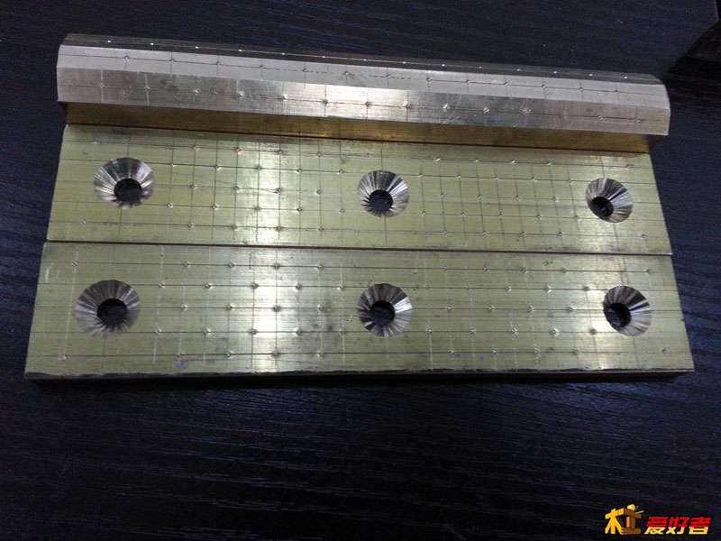 繼續(xù)畫石墨孔的位置,并沖定位孔。我兩條線的距離是5MM,用的石墨柱也是5MM的