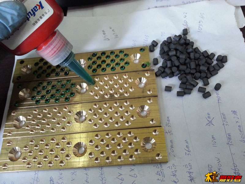 下面開始鑲嵌石墨柱,這里要用到厭氧膠,厭氧膠有很多型號(hào),這里要用到的是粘接圓柱的膠,這種